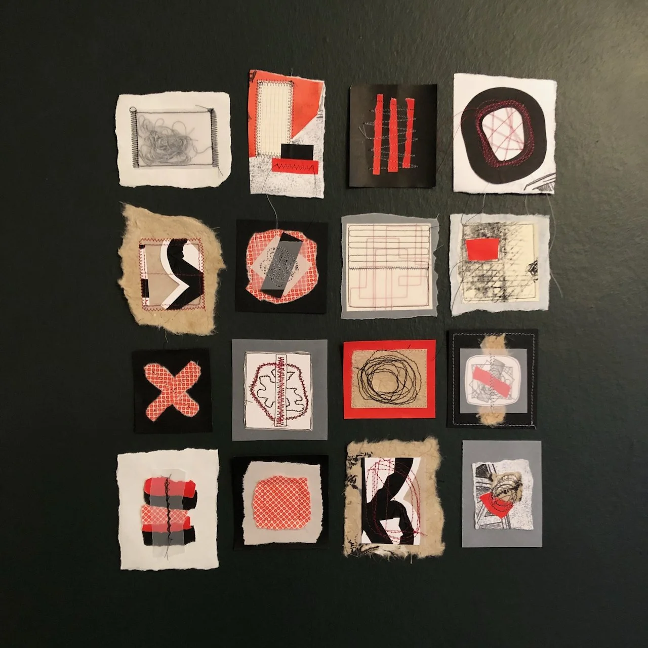 mixed media miniature works on paper - ink, pen, fabric, tape, stitch, biro, acrylic